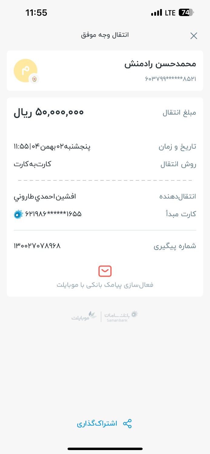 مبلغ 5/630/000 تومان به خیریه حمایت از بیماران پوستی خاص (پروانه) خانه ای بی واریز شد.