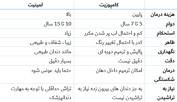 زمانی که کامپوزیت آسیب ببیند می توان آن را داخل دهان ترمیم کرد ولی در مورد لمینت اینگونه نیست و باید واحد مورد نظر تعویض گردد.