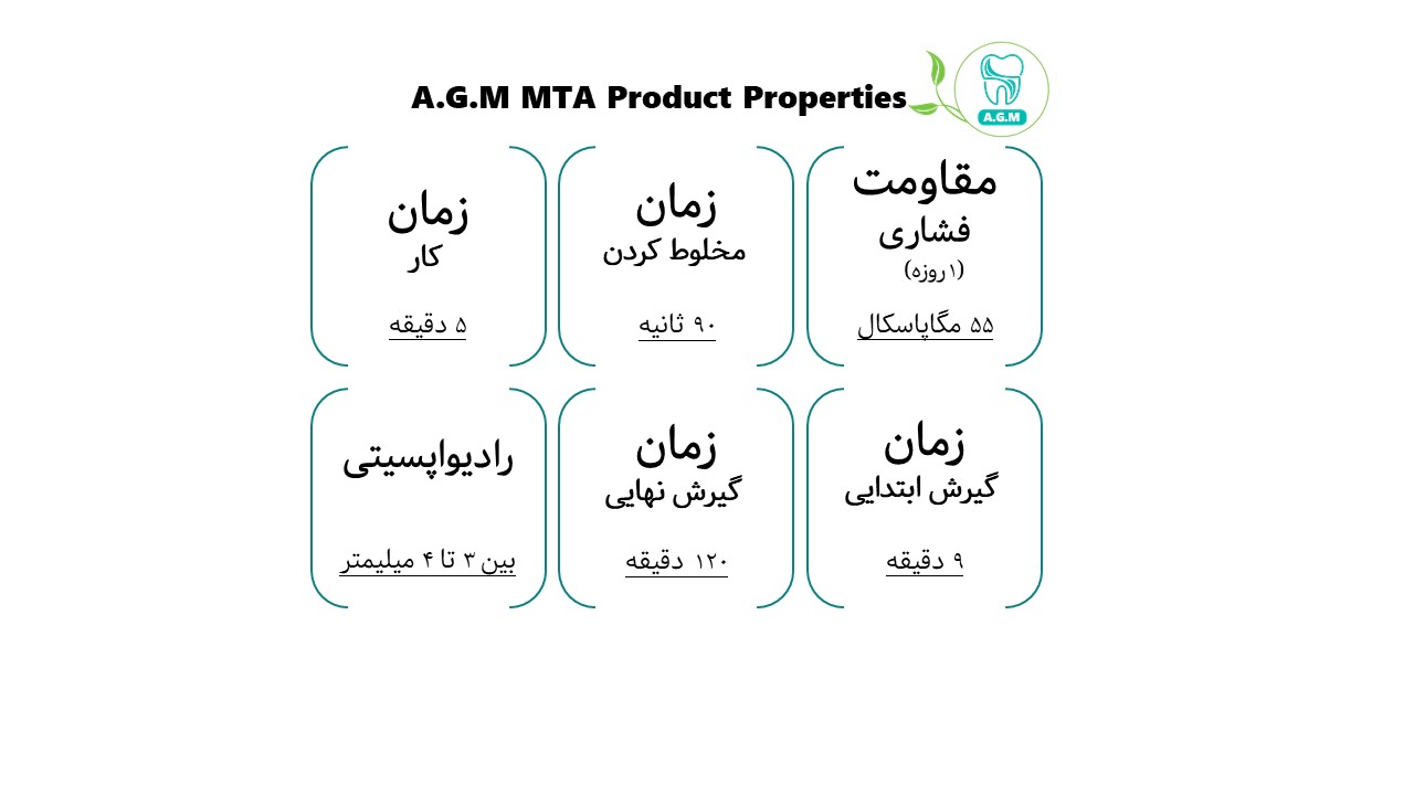 سمان Mta ام تی ای AGM یک سمان بیوسرامیک اندو با قدرت ترمیمی عالی میباشد که از دو جزء مایع و پودر تشکیل شده است. جزء پودری شامل فازهای مختلف سیلیکاتکلسیم، سیلیکاتالومینیوم و دیاکسید زیرکونیم بوده و جزء مایع حاوی آباستریل، کلسیمکلراید و ماده قوام دهنده طبیعی میباشد. در موارد استفاده از این سمان به عنوان پوشاننده پالپ، بهبود ترمیم بیولوژیکی و القای بازسازی بافت سمنتوم و ریشه، یونهای کلسیم آزاد شده از سمان باعث تشکل پل عاجی میشود. این سمان به منظور کاربرد در شرایط مرطوب طراحی شده که با جذب آب به فرم ژل درآمده و سپس سخت میشود.